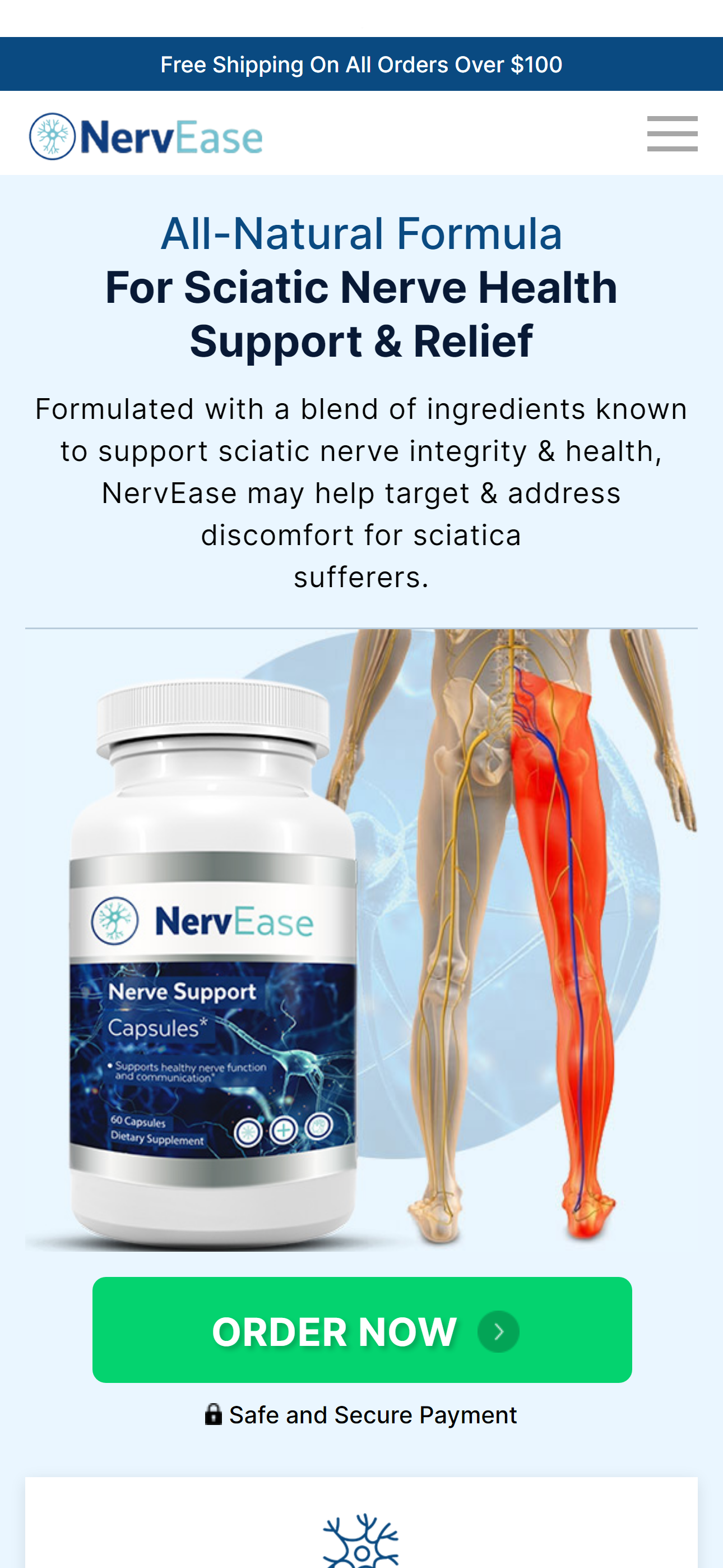 NervEase is a daily capsule supplement formulated to support sciatic nerve health, mobility, and everyday comfort. It is positioned as a natural formula for adults who want added nerve support as part of a balanced lifestyle. :contentReference[oaicite:1]{index=1}